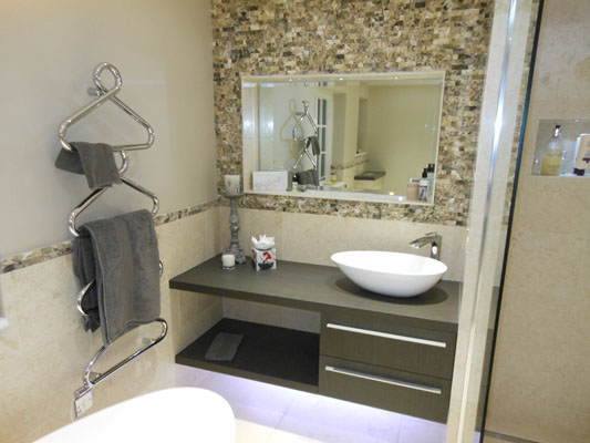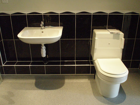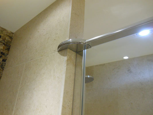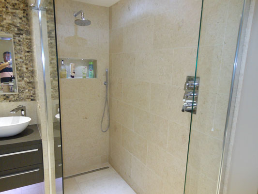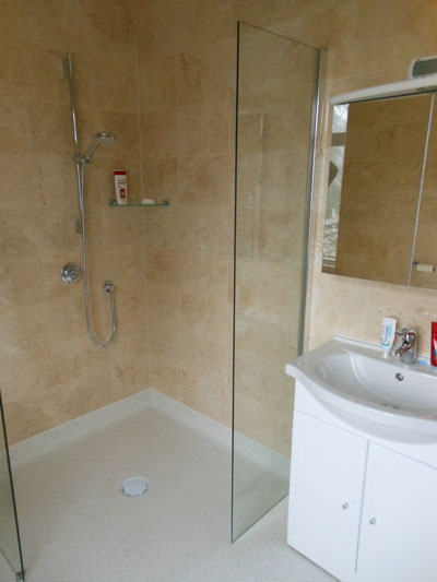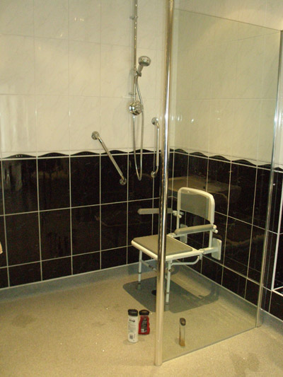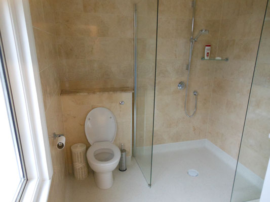 Wet floor shower with twin full height glass screens. The slip resistant vinyl flooring is coved and welded.