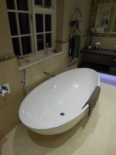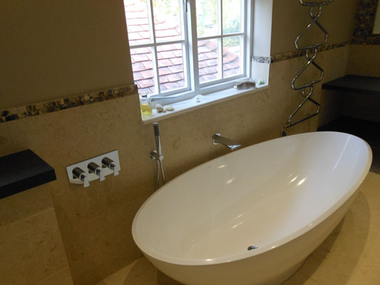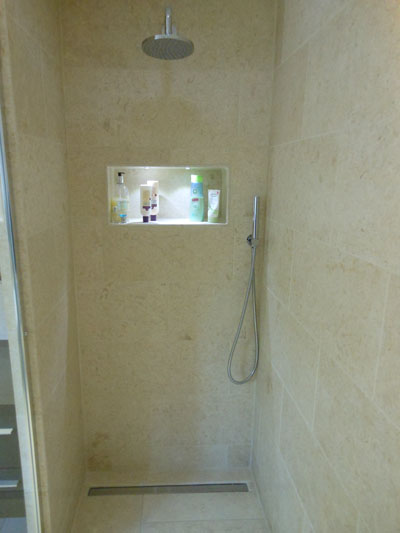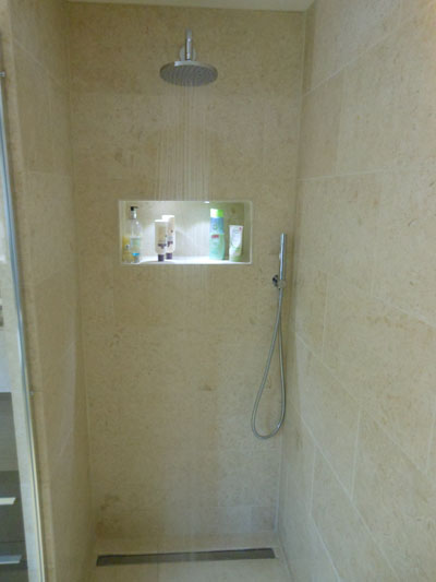Free standing bath and wet floor shower with linear drain. Walls and floor tiled in stone tiles.